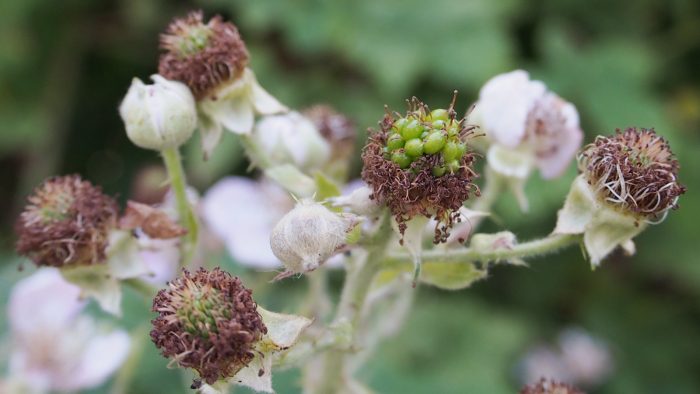 Rubus fruticosus, stage 2 (161/365) Posted on June 10, 2017Categories 2017-365, flowers, fruit, Olympus, spring Taken: June 10, 2017